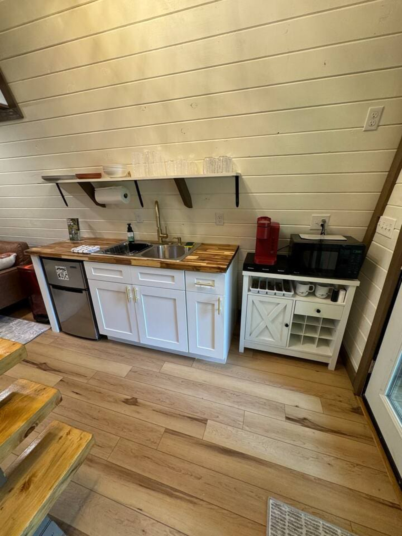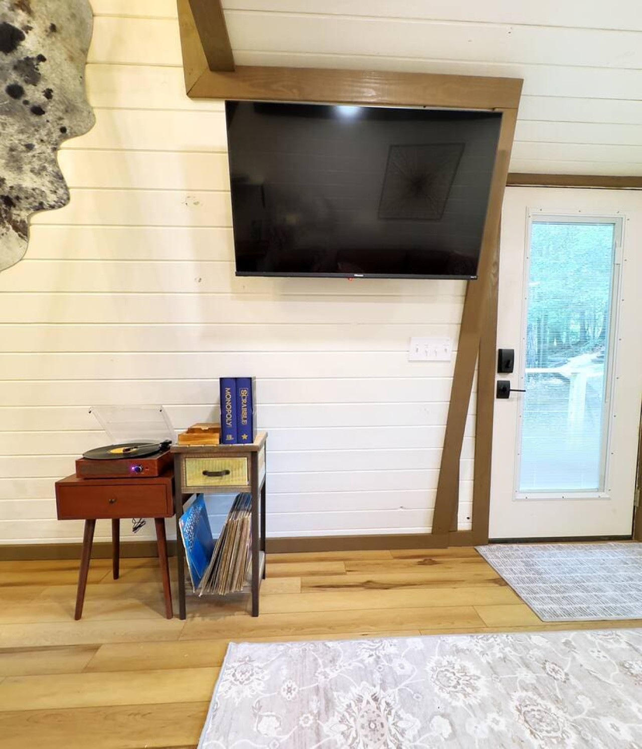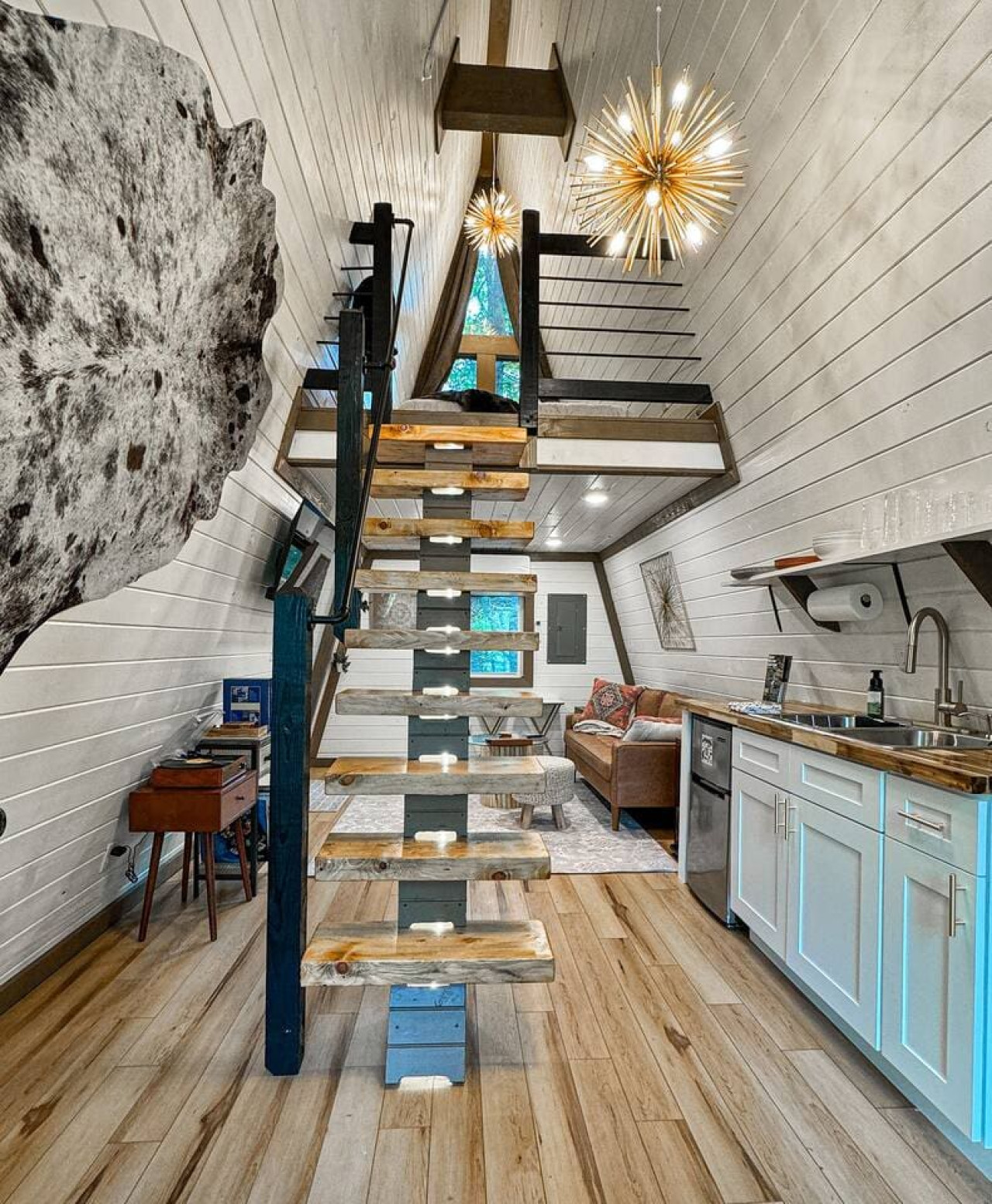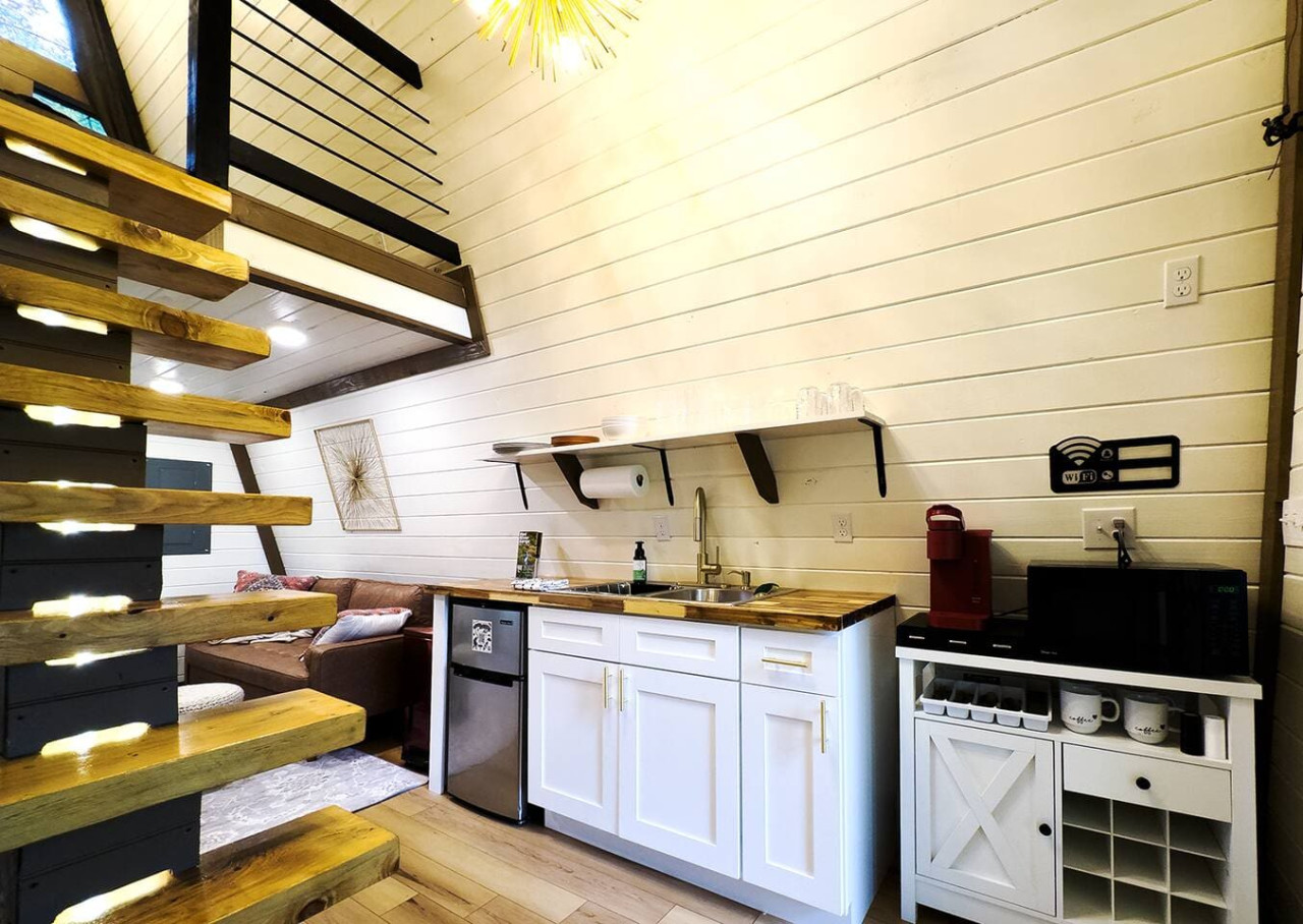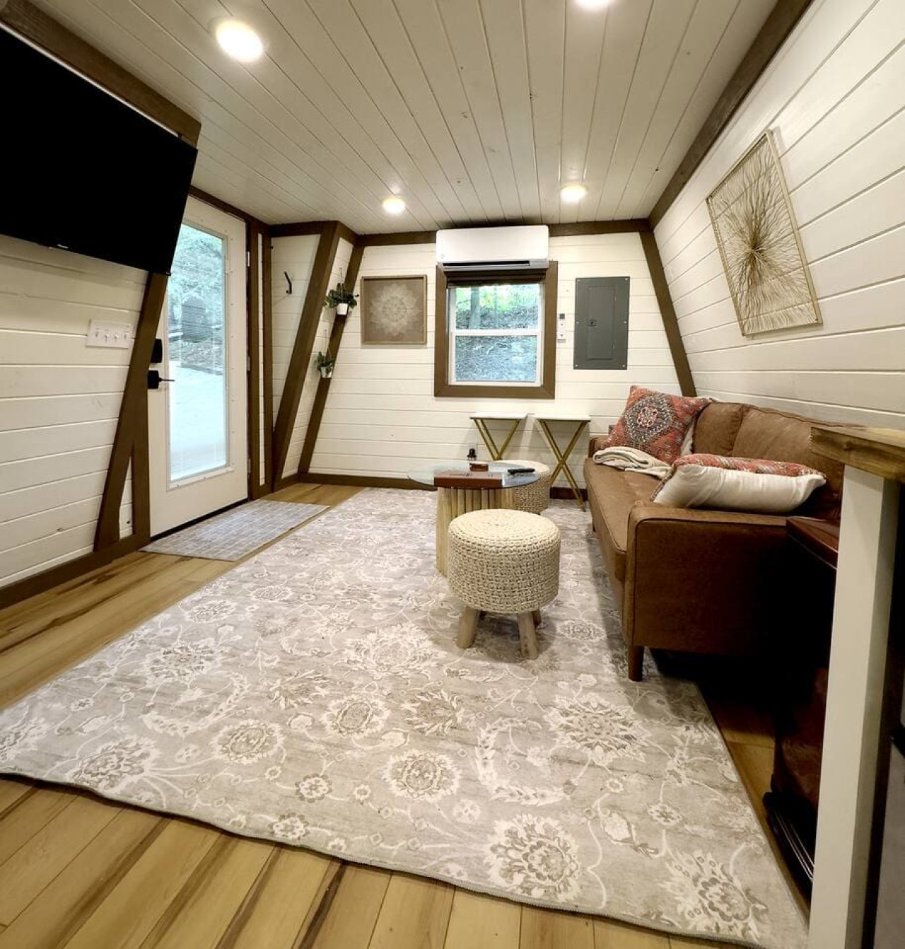 Wolf Pup is an adult-only, gorgeous black A-frame with a kitchenette, living space and queen bed in the loft area. Perfect for 2 to create memories that you will never forget! This modern cottage has heating and AC in the onsite mini split unit as well as cold water in the kitchenette. The cottage also contains a microwave, Keurig coffee pot, mini fridge and TV. The back deck is the most captivating amenity as it boasts a hammock net that puts you right up in the treetops!