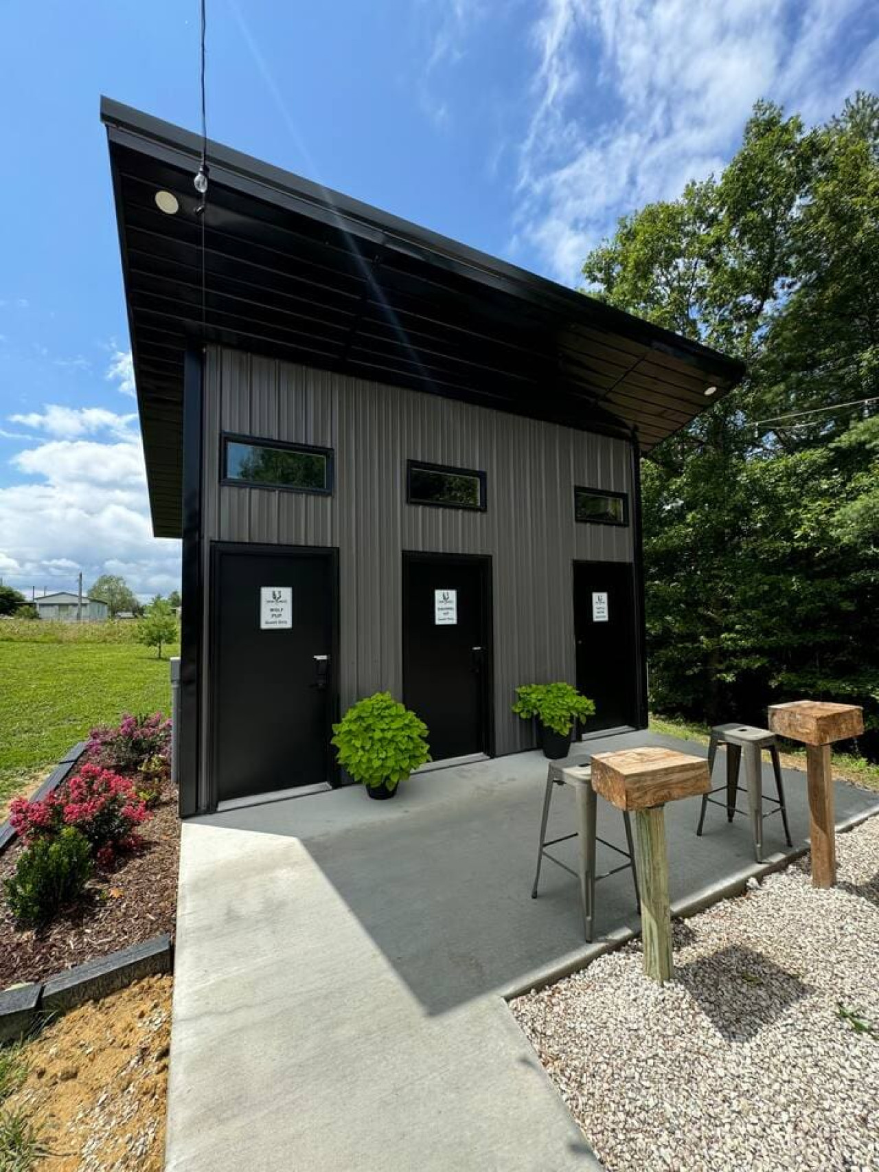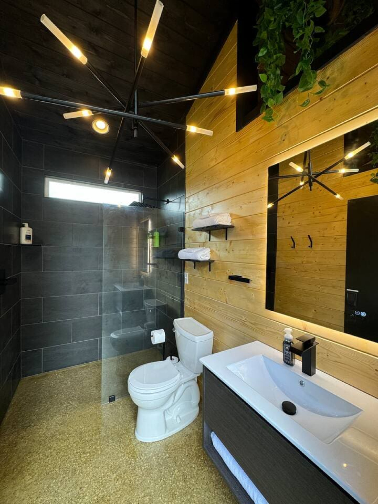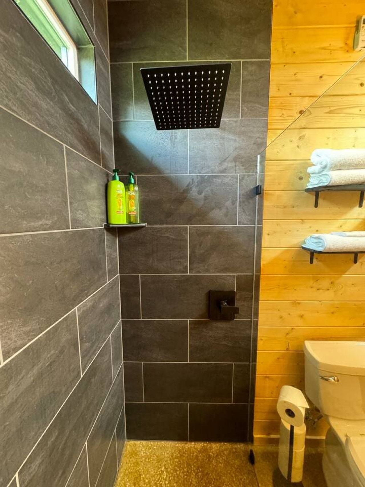 The gorgeous private bathrooms are a short walk from the cabin and contain a sink, toilet and custom tile shower. Each one is specifically assigned to each cabin and has a keypad entry.
