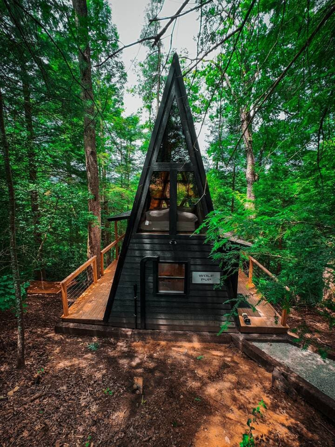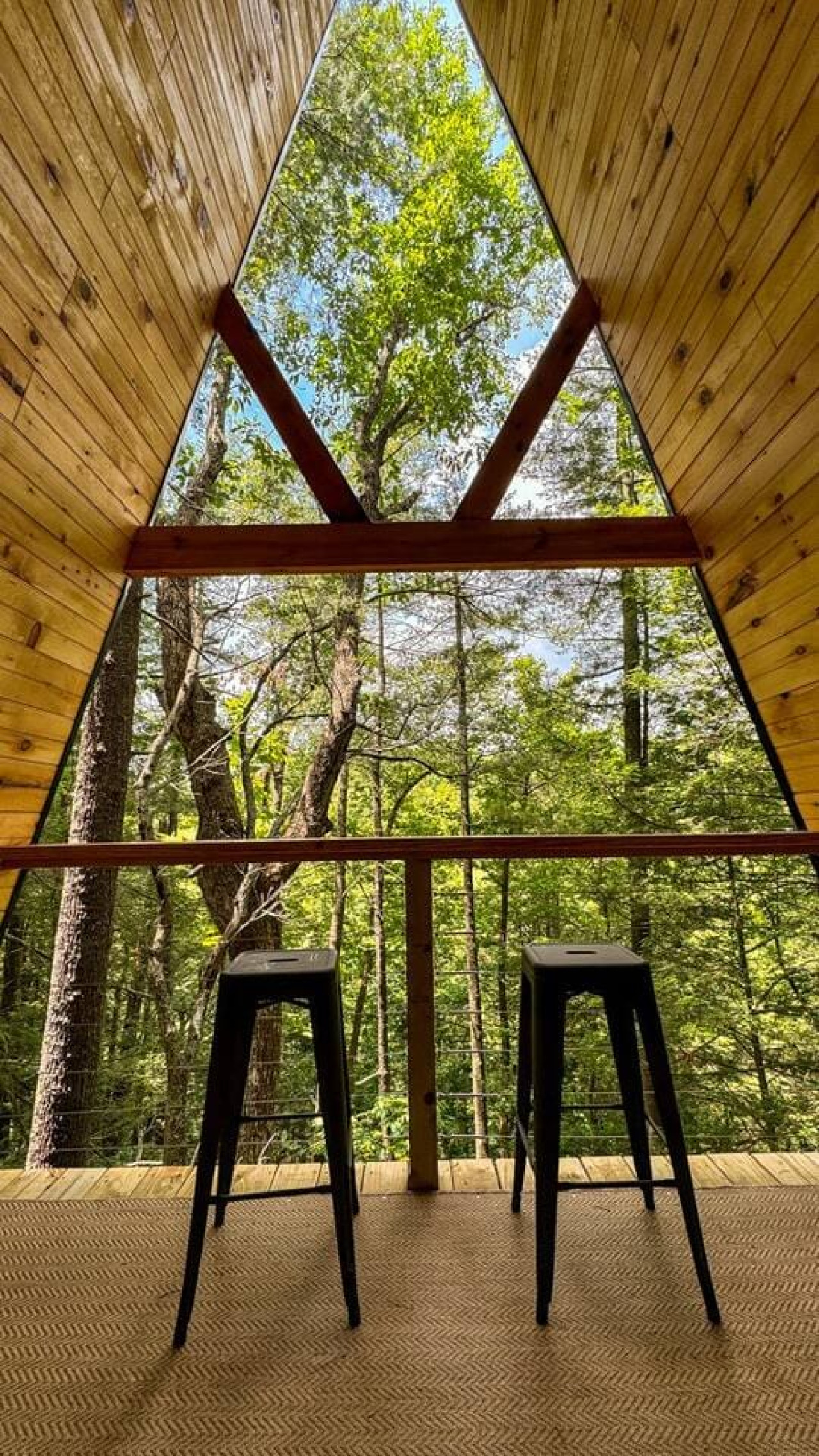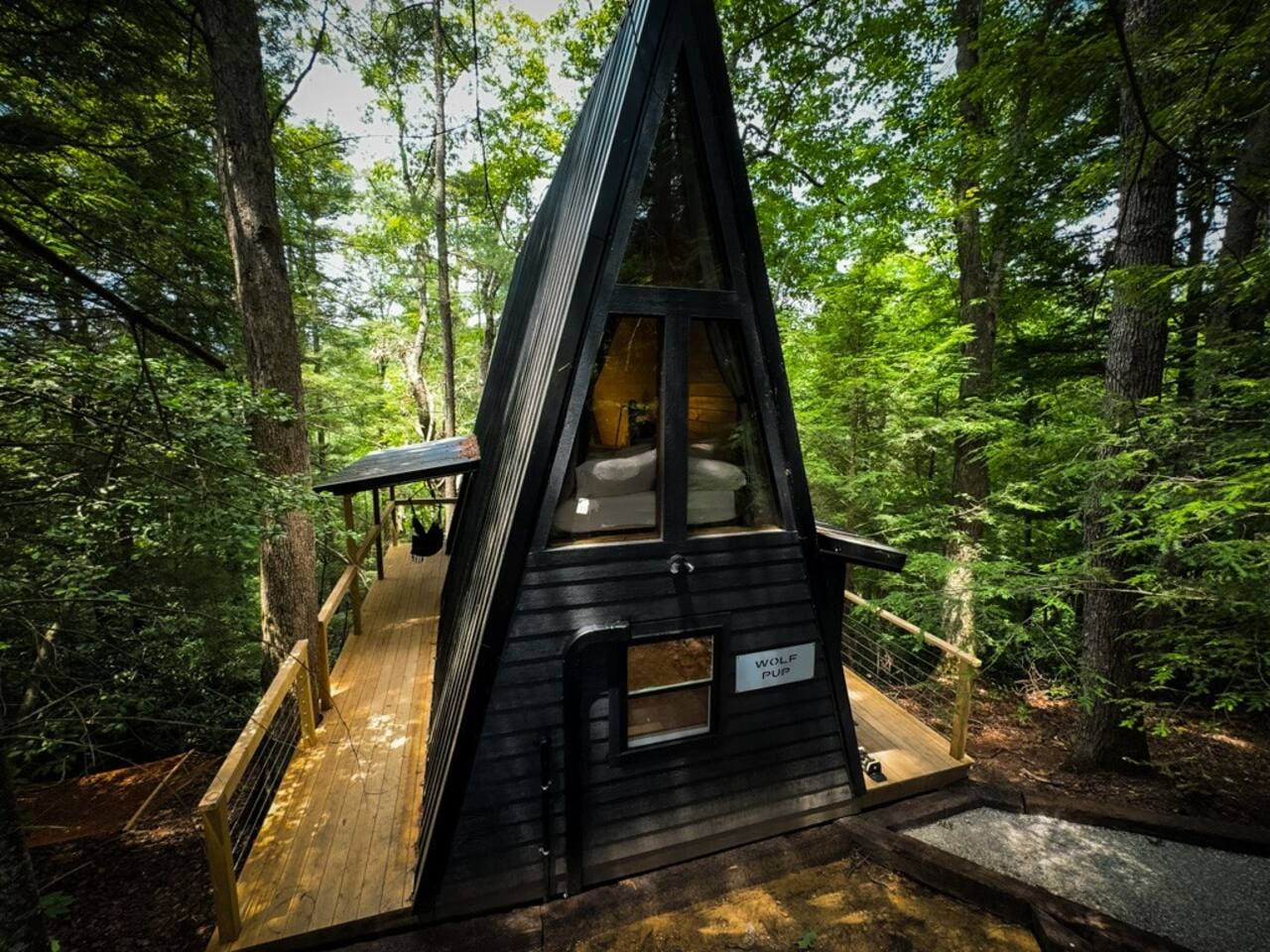 Wolf Pup is one the areas first A-frame treetop cottages situated on a hillside in the woods! Reconnect with nature that completely surrounds you, as you take in the 30-foot drop, on the back deck at this unforgettable escape. It is a cozy studio for 2 with a kitchenette and small living room. Traverse up the loft ladder steps to find a secluded queen bed with unbelievable views! The real treasure of this cabin is fully immersing yourself in the forest, while enjoying the relaxing hammock net!