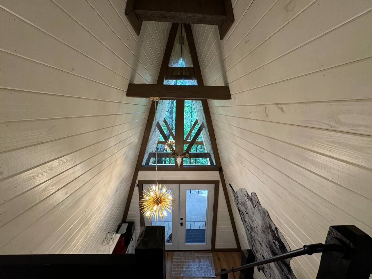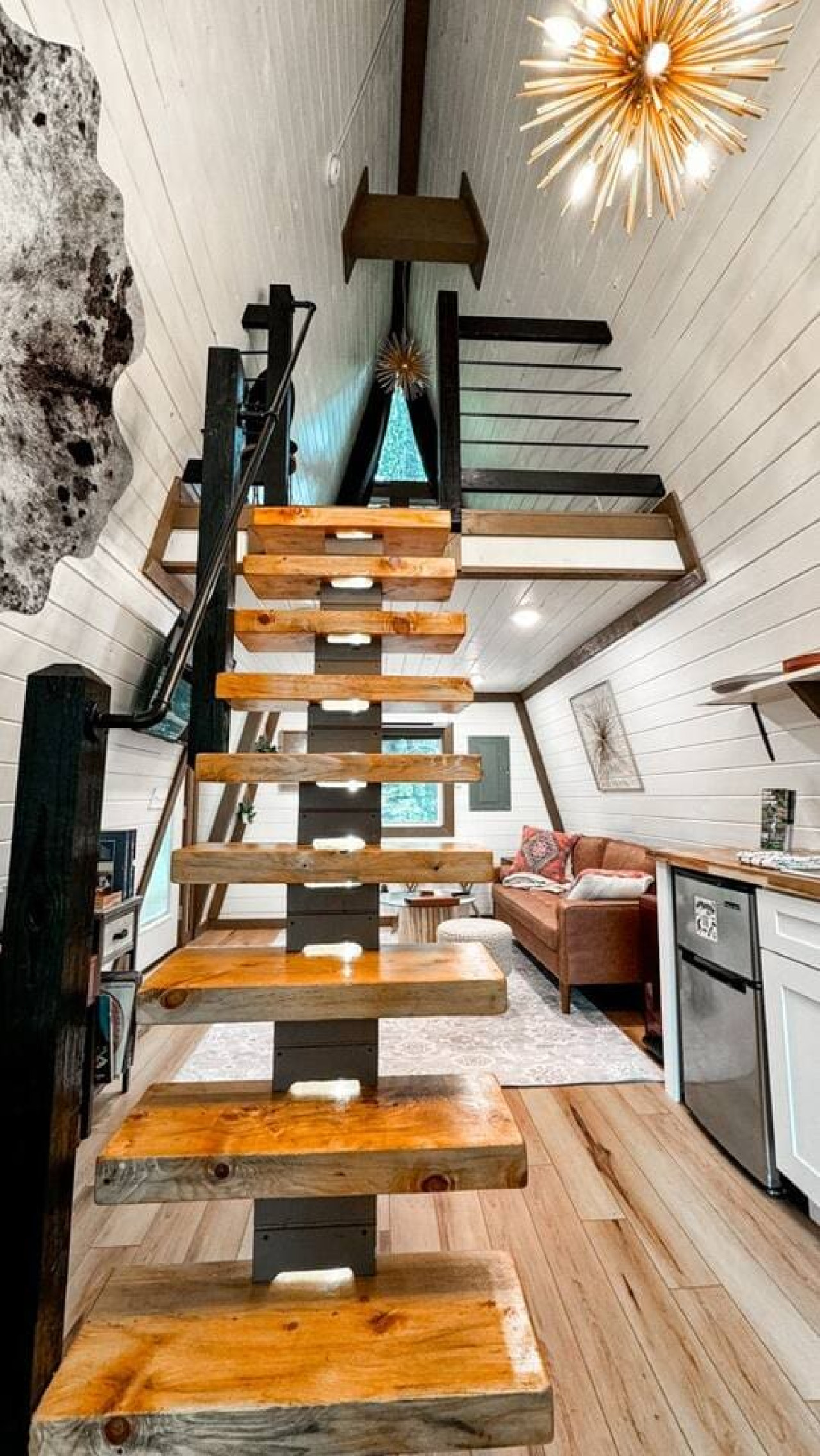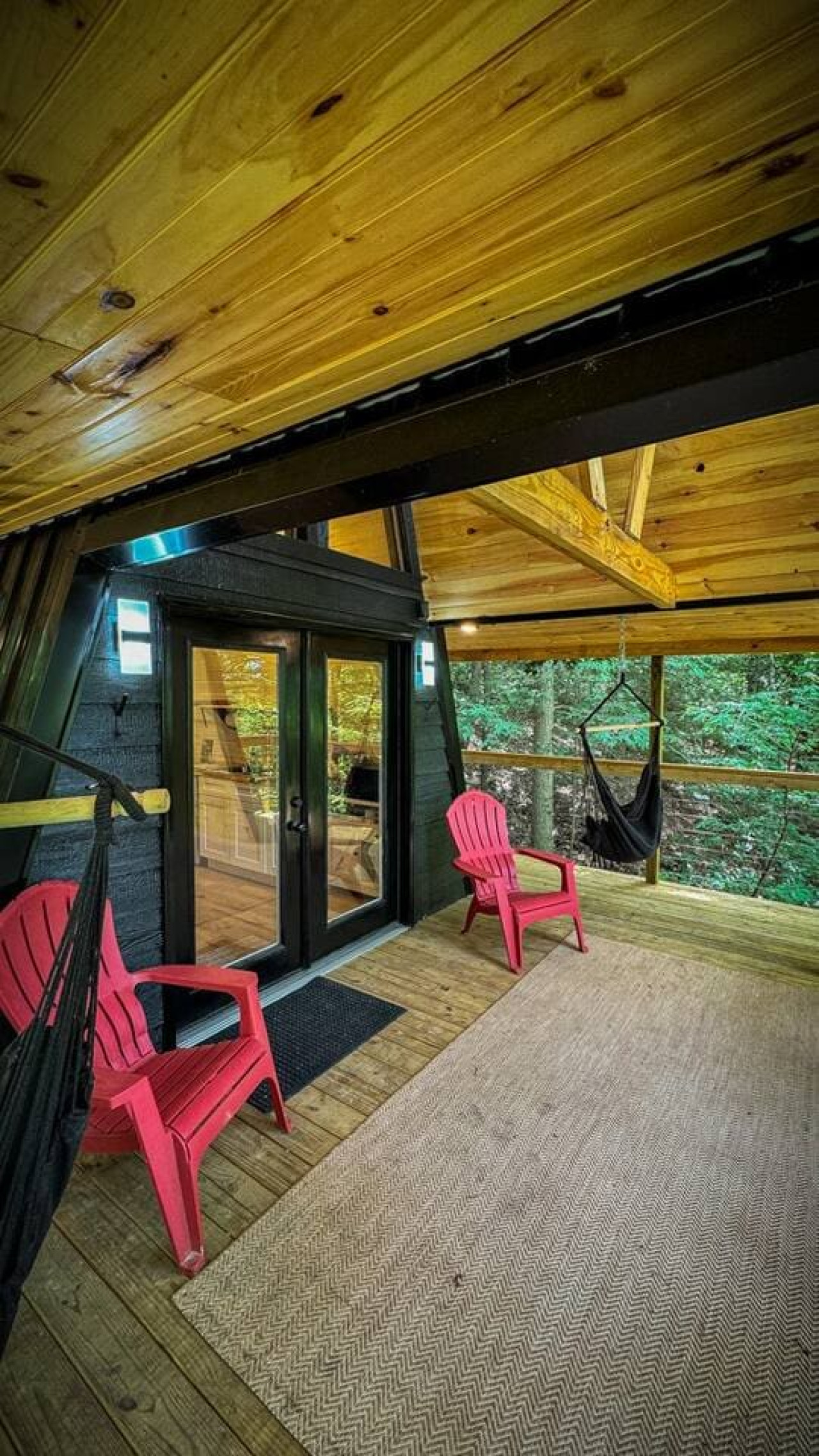 Wolf Pup is one the areas first A-frame treetop cottages situated on a hillside in the woods! Reconnect with nature that completely surrounds you, as you take in the 30-foot drop, on the back deck at this unforgettable escape. It is a cozy studio for 2 with a kitchenette and small living room. Traverse up the loft ladder steps to find a secluded queen bed with unbelievable views! The real treasure of this cabin is fully immersing yourself in the forest, while enjoying the relaxing hammock net!